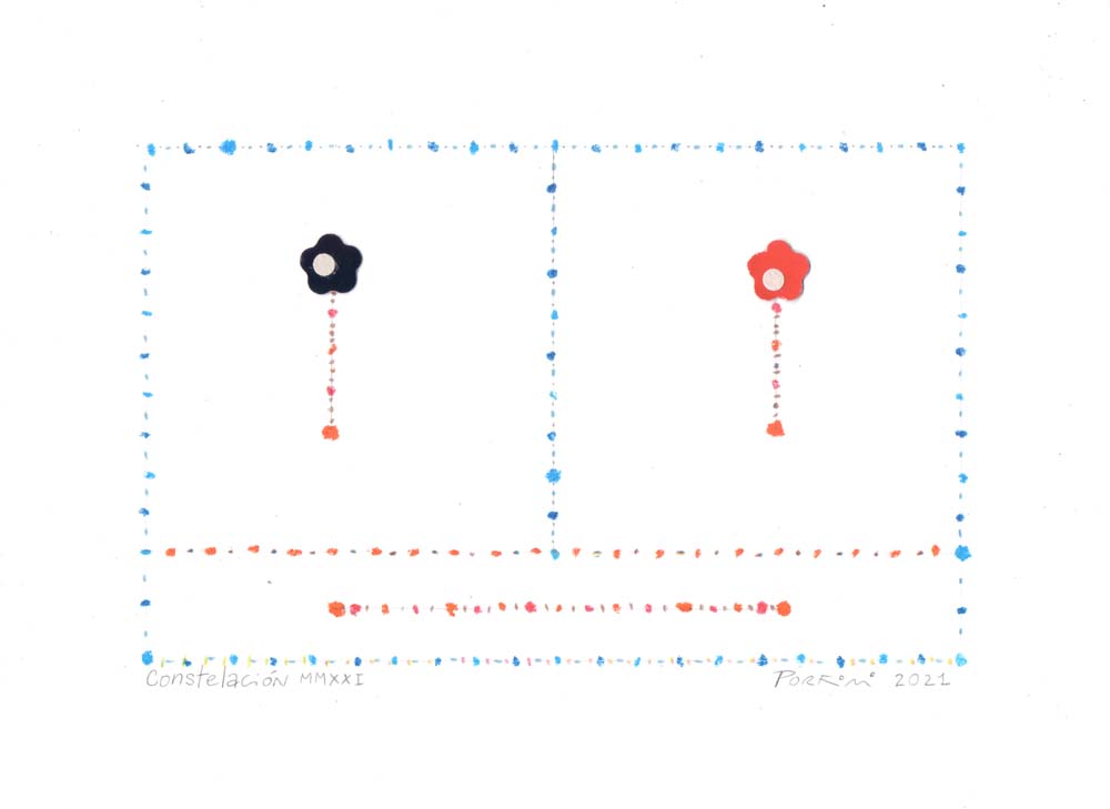 Constelación MMXXI, 2021, collage, lápiz y pastel sobre papel, 18 x 25 cmConstelación MMXXI, 2021, collage, lápiz y crayón sobre papel, 20 x 27,5 cmConstelación, 2021, acrílico y ceras acuarelables sobre chapadur, 15,5 x 17,5 cmPortal III, 2020, lápiz y birome sobre papel, 19,5 x 19,5 cmVisitante I, 2020, acrílico y lápiz sobre papel, 25 x 34 cm