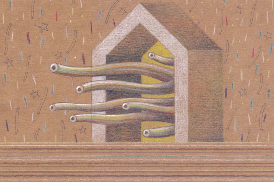 Edificio, 2020, acrílico, tiza y lápiz sobre papel, 27,6 x 16,7 cm
