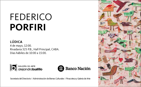 Las obras de Porfiri son dibujos, pinturas, collages, assemblages y un original abecedario imantado que sólo pueden completarse mediante la actividad conceptual e imaginativa del público. Los pequeños tondos en madera se autodenominan en conjunto formando la palabra “boceto” y un cartel nos indica votar nuestra obra predilecta para que el artista la efectúe en gran formato. Las elocuentes escenas simbólicas se presentan cual fragmentos de relatos cuyo inicio y desenlace nos atañe evocar. Mientras que los retratos de sus enigmáticos personajes esperan ser dilucidados.