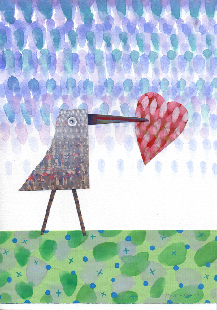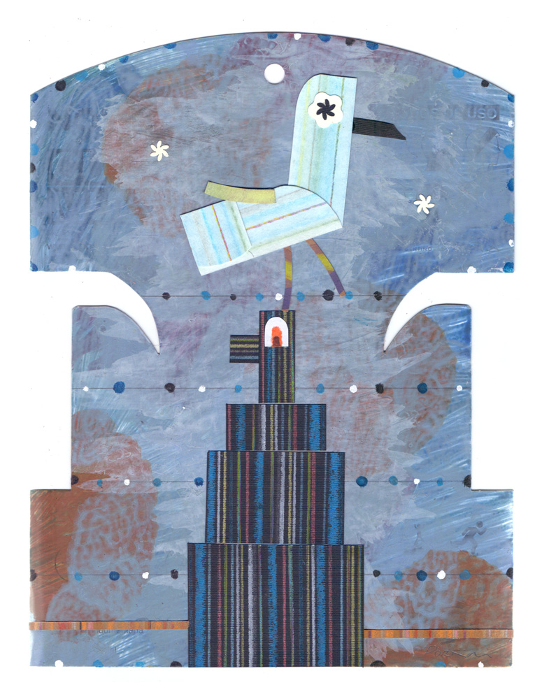 Pájaro con cabeza, 2021, técnica mixta y collage, 15,5 x 18,5 cm