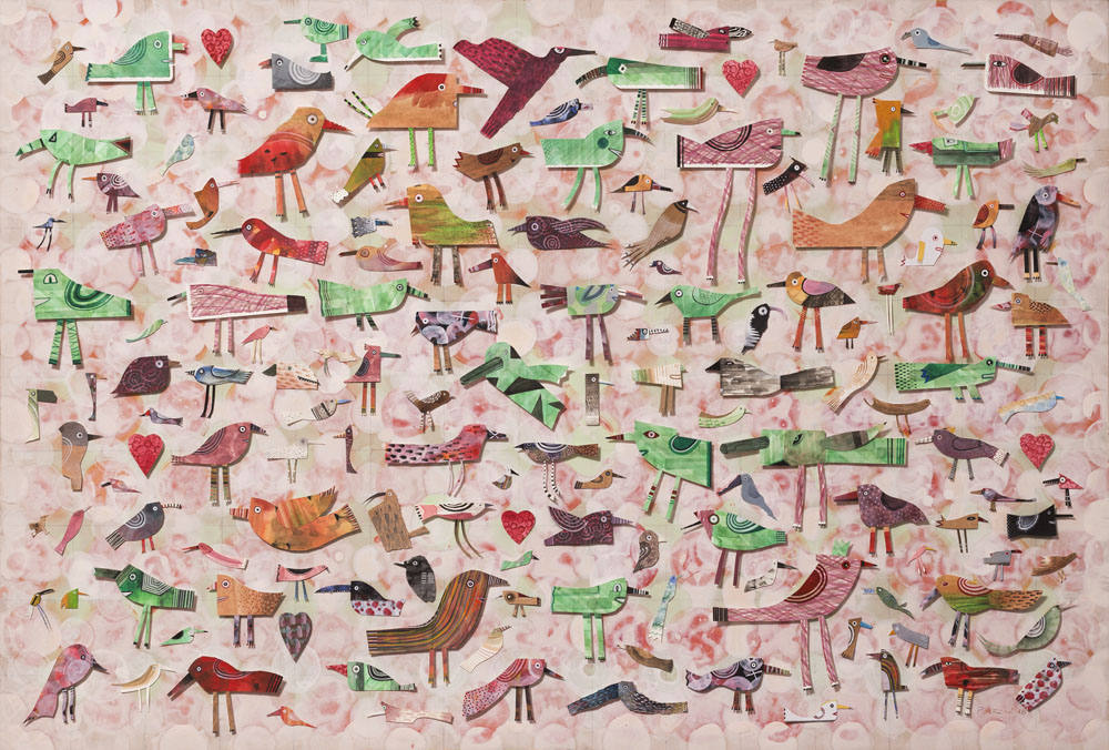 Pájaros, 2018, collage sobre MDF, 100 x 150 cm