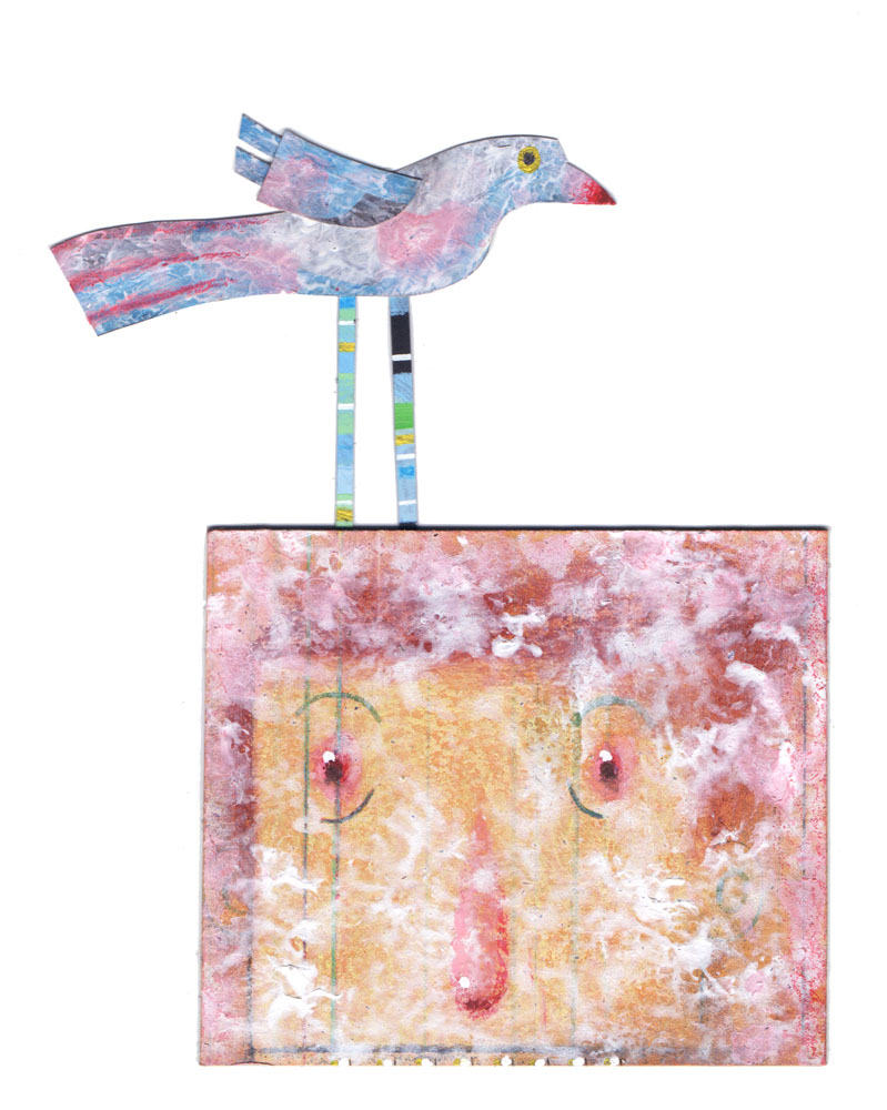 Pájaro en la cabeza, 2021, acrílico y collage sobre cartón, 27 x 21 cm